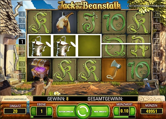 Jede der 20 vorhandenen Paylines kannst du ab einem Cent Einsatz aktivieren. Neben dem Münzwert lässt sich auch die Einsatzebene einstellen. Bis zu 10 Münzen pro Linie können gesetzt werden. Eines der Spezialsymbole in Jack and the Beanstalk ist die Schatztruhe. Sie eröffnet dir 10 Gratisspielrunden, sofern drei und mehr dieser Bilder auf beliebigen Positionen zu sehen sind. Innerhalb der Free Spins lassen sich weitere Gratisdrehungen gewinnen – jeweils fünf pro drei und mehr Schatztruhen. Der Schriftzug „Jack and the Beanstalk“ erweist sich ebenfalls als sehr nützlich. Er ist als Joker zu verstehen, der jedoch nicht fest auf einer Position bleibt, sondern von rechts nach links jeweils eine Position weiter wandert, um nach jeder Bewegung einen Respin auszulösen. Alle Gewinne werden mit Abschluss der Sonderrunden addiert und deinem Spielerkonto im Casino Euro gutgeschrieben.